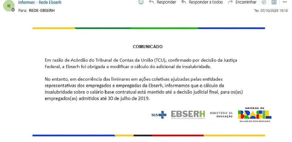 No comunicado, a empresa informou: “Em decorrência das liminares em ações coletivas ajuizadas pelas entidades representativas dos empregados e empregadas da Ebserh, informamos que o cálculo da insalubridade sobre o salário base contratual está mantido até a decisão judicial final, para os(as) empregados(as) admitidos(as) até 30 de julho de 2019.”